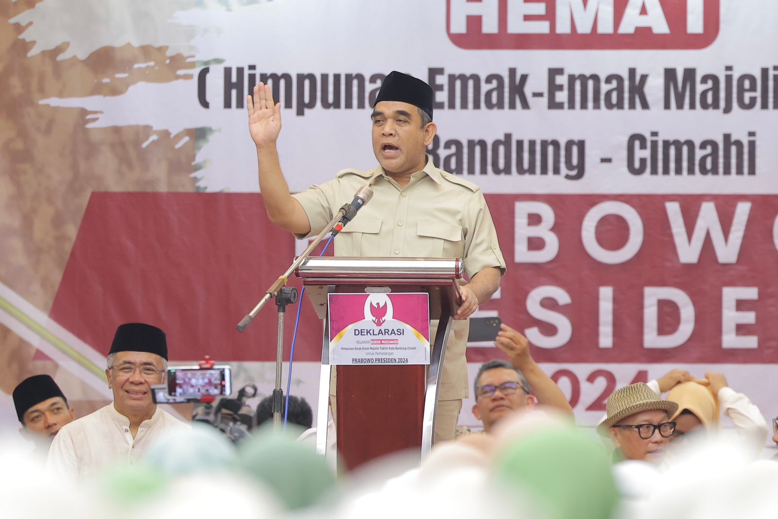 Sekjen Partai Gerindra Ahmad Muzani menghadiri deklarasi dukungan ribuan emak-emak yang tergabung dalam 540 majelis taklim se Kota Bandung dan Cimahi, di Kota Bandung, Kamis (14/9). Di hadapan ribuan emak-emak Muzani menyampaikan komitmen Prabowo saat menjadi Presiden di Pilpres 2024.